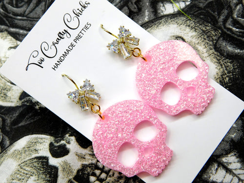 Baby Pink Skull Dangles w/ Cubic Zirconia Bow Fish Hooks