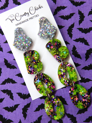 Green & Halloween Confetti BOO Dangles w/ Ghost Tops