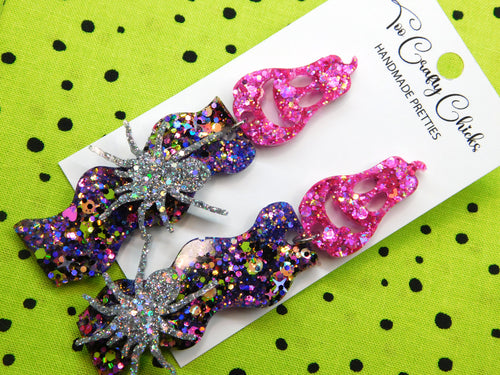Large Baby Pink Spider Dangles w/ Black Witch Hat Tops
