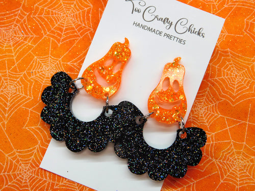 Orange Oblong Jack-O-Lantern Dangles w/ Black & White Flower Tops